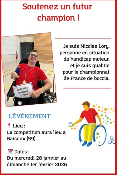 Je suis Nicola Lorys, personne en situation de handicap moteur et je suis qualifié pour le championnat de France de boccia.
