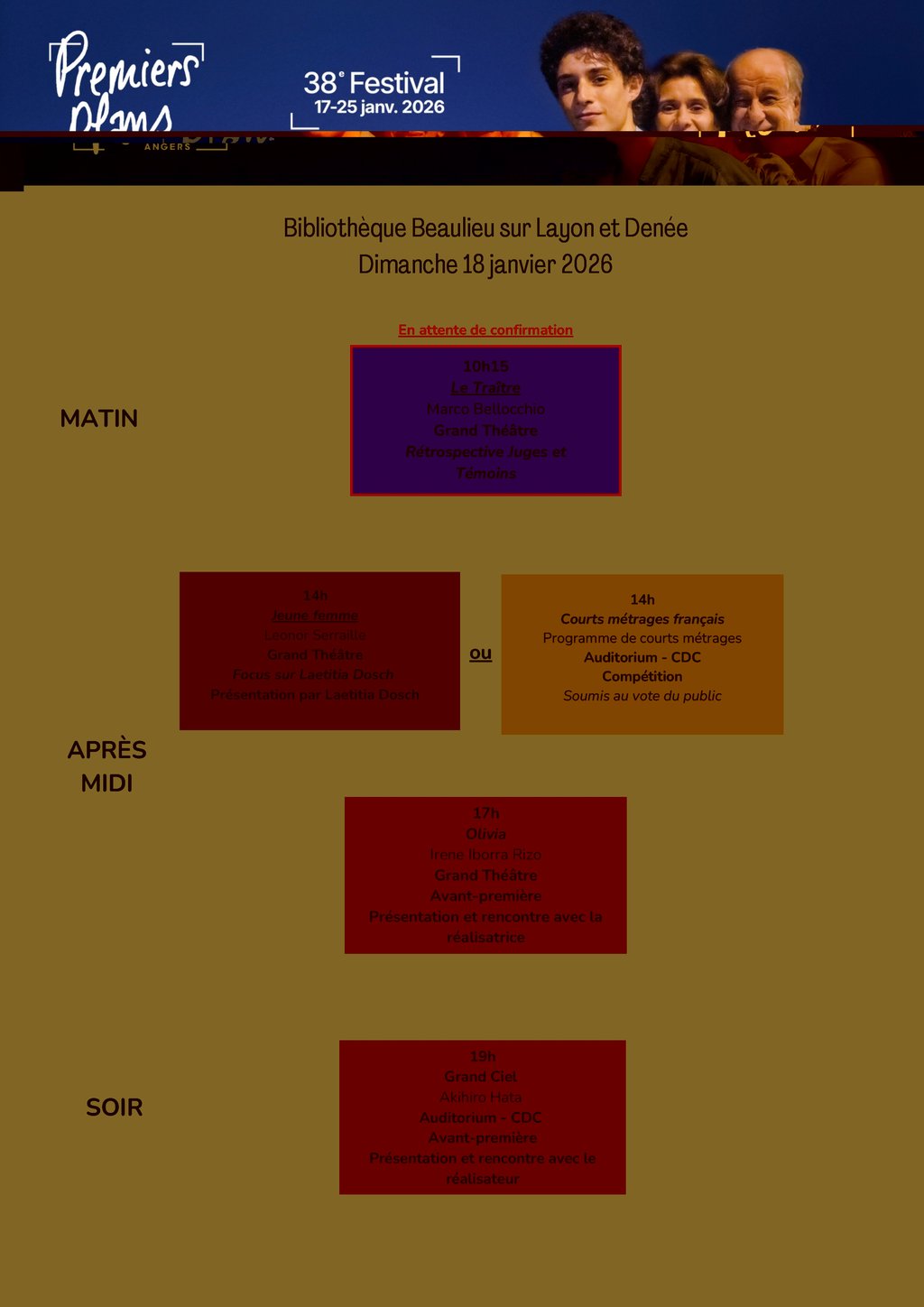 Les bibliothèques municipales de Beaulieu et Denée s'associent pour vous proposer une sortie cinéma au Festival Premiers Plans d'Angers le dimanche 18 janvier. Au programme : des rétrospectives, des courts métrages français en compétition, un film d'animation tout public et un film en avant-première. Plus de détails ci-joint.