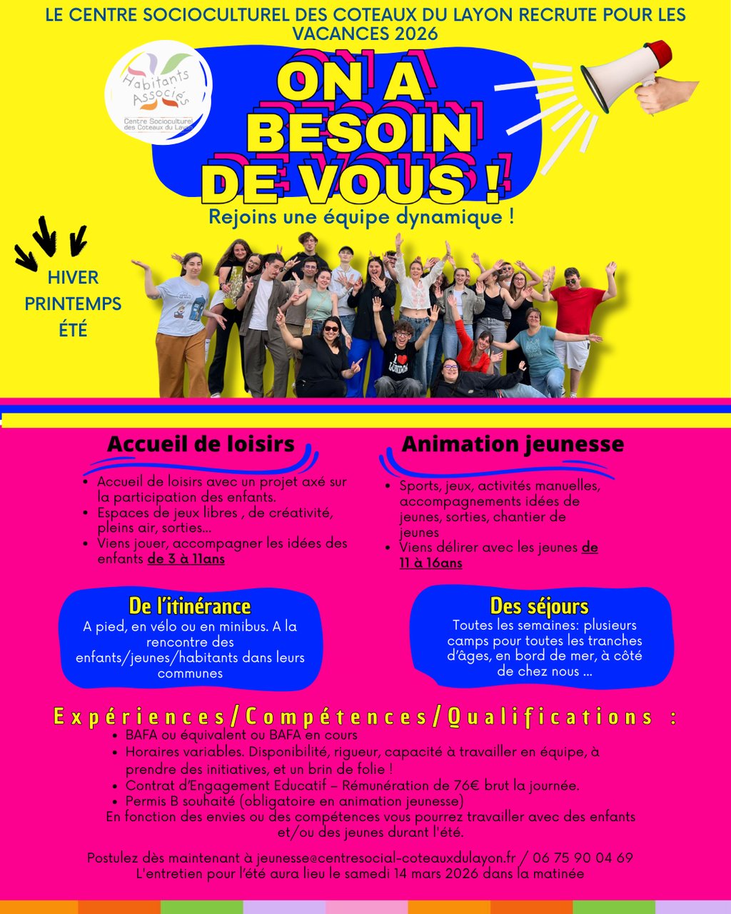 đŁL'ĂQUIPE DE CENTRE SOCIOCULTUREL RECHERCHE DES ANIMATEURS POUR LES PROCHAINES VACANCES