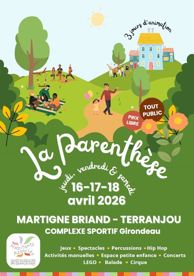 Du Jeudi 16 au Samedi 18 Avril (oui, oui un samedi !), la traditionnelle "Parenthèse" fait son grand retour !!! Retrouvez-vous au complexe sportif Girond’O de Martigné Briand pour 3 jours d’animations diverses et variées, de concerts, de jeux… POUR TOUS LES GOÛTS ET TOUS LES ÂGES !!