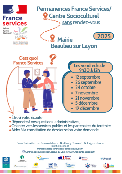 France Services vous accueille à la mairie de Beaulieu sur Layon, le vendredi de 9 H 30 à 12H (calendrier disponible à l'accueil de la mairie).