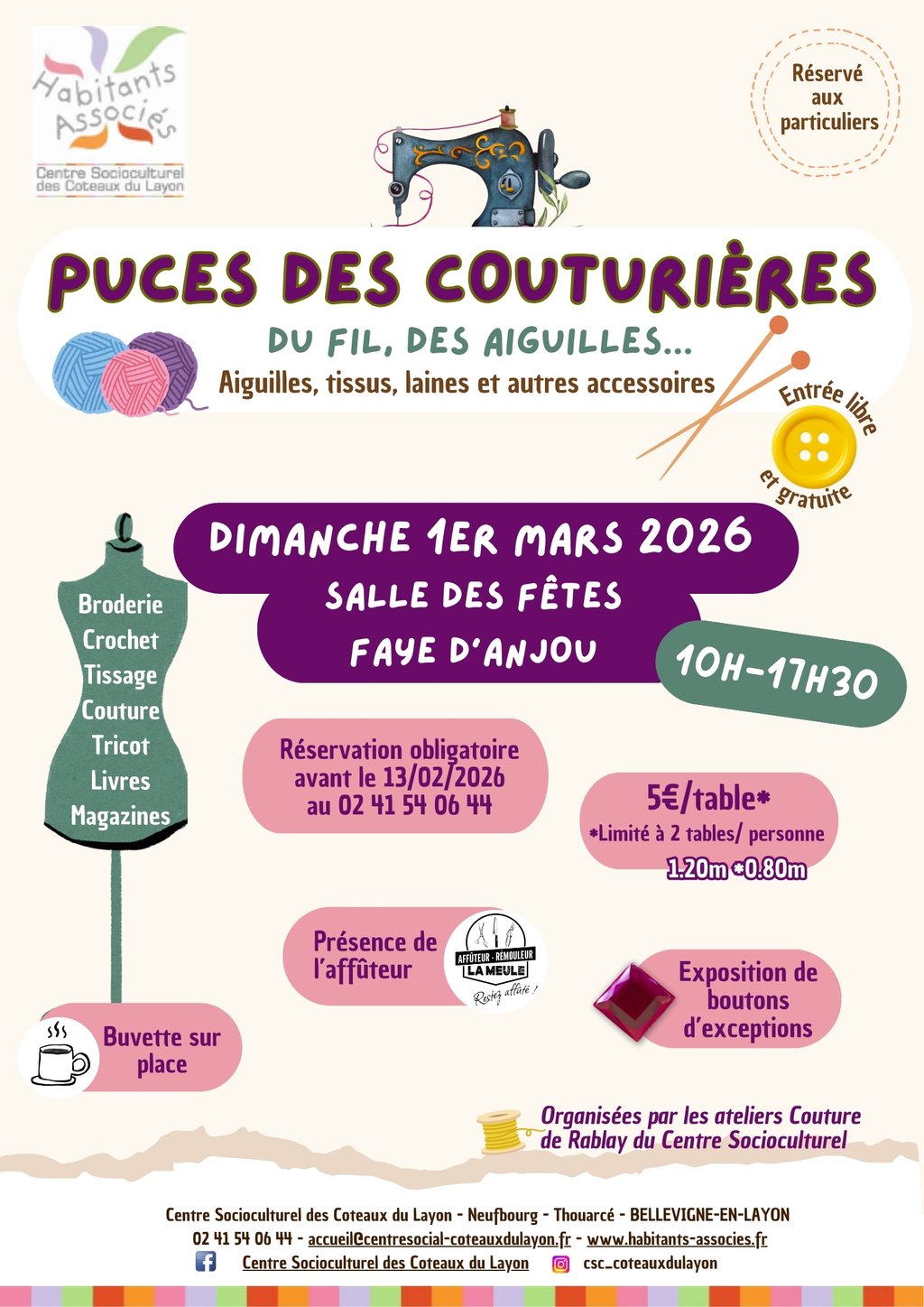 - Pour les exposants : Inscriptions jusqu’au 13/02 par mail : accueil@centresocial-coteauxdulayon.fr ou au 02 41 54 06 44- 5€/table (max : 2 emplacements/personne, réservé aux particuliers)