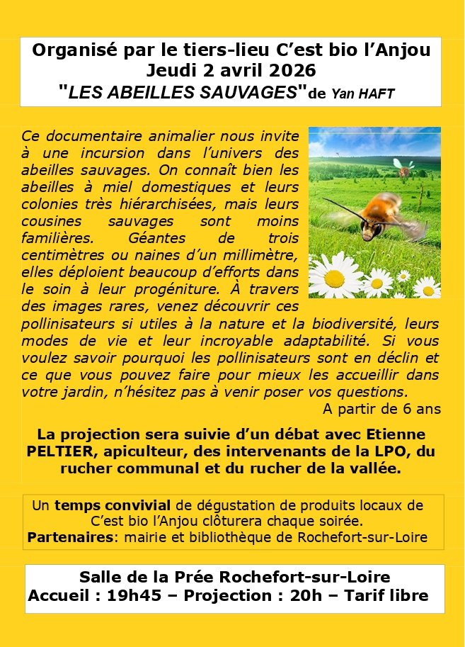 La projection sera suivie d’un débat avec Etienne PELTIER, apiculteur, un intervenant de la LPO, des bénévoles du rucher communal et du rucher de la vallée de Rochefort-sur-Loire.